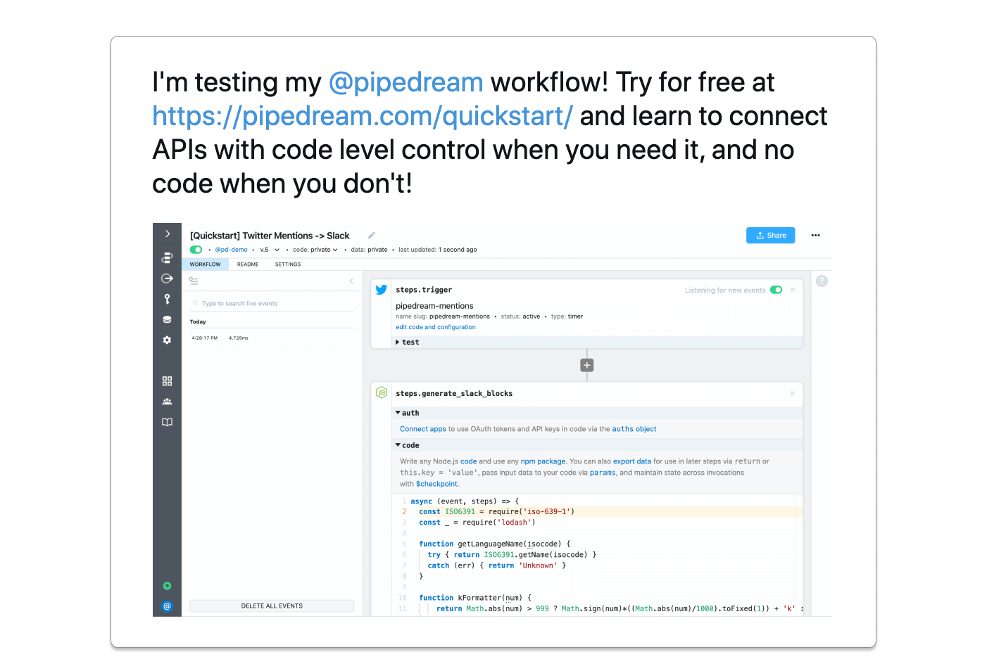 # Trigger a workflow anytime @pipedream (opens new window) is mentioned on Twitter